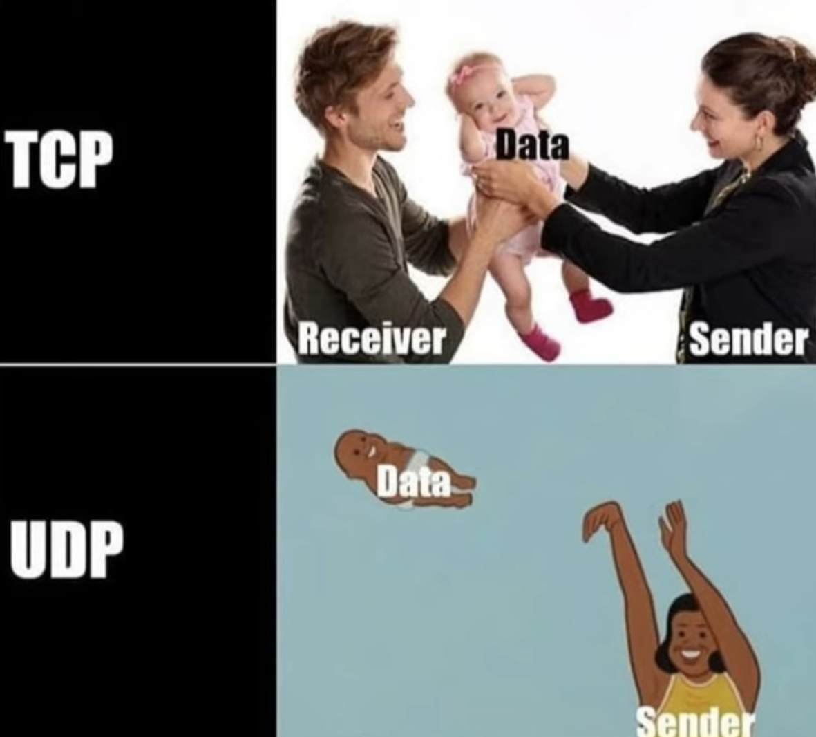- TCP (Transfer Control Protocol): spojovaný, ověřuje přichod dat a je spolehlivý, kontroluje pořadí paketu a případné kopie